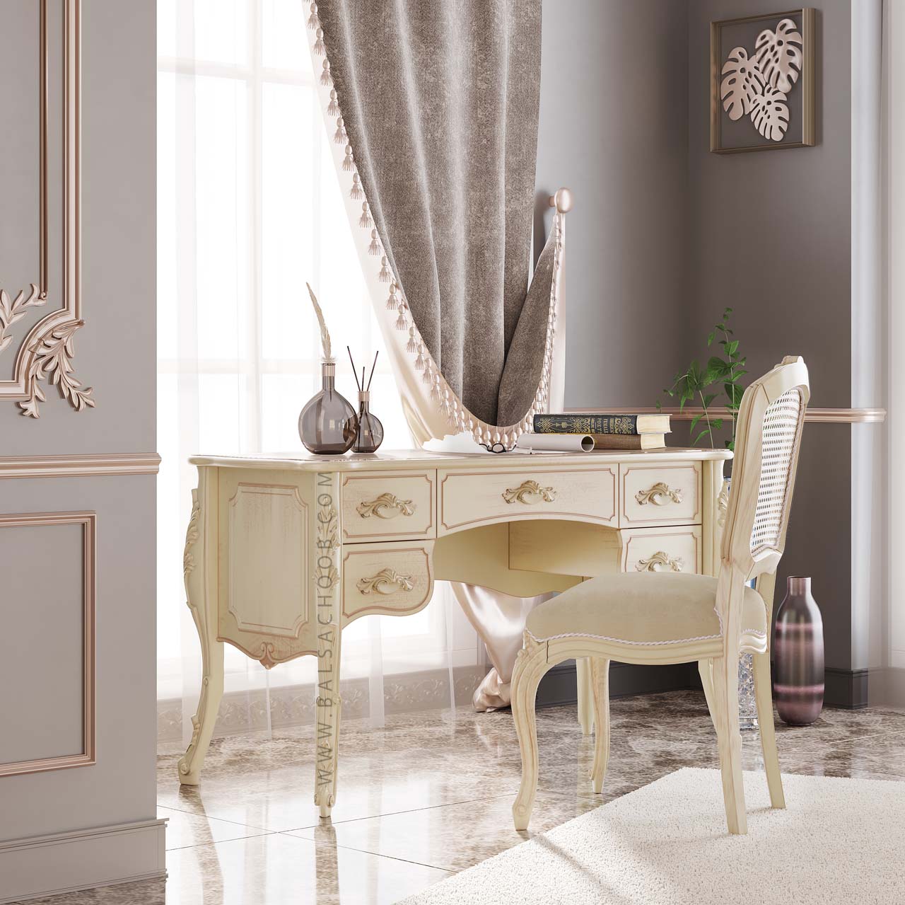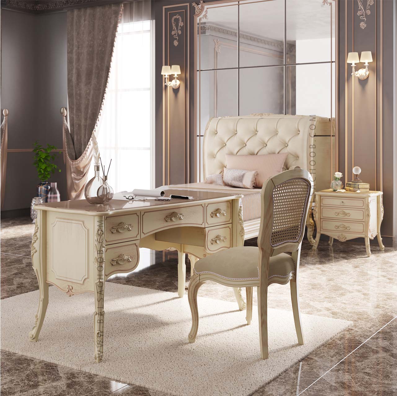 سرویس خواب بنیتو، تجلی سبک نئوکلاسیک است. ترکیبی از اصالت خراطیهای دستساز با جزئیات ظریف و طراحی روان که به هر اتاق خوابی شخصیت و شکوهی منحصربهفرد میبخشد. این سرویس با بیس رنگ کرم و پتینهای با تُن رزگلد نرم، بهراحتی با هر سبک دکوراسیون هماهنگ میشود و جلوهای دلنشین و لوکس خلق میکند.