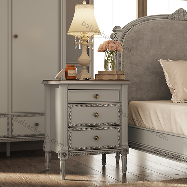 ابزارهای ساده و در عین حال زیبا، بر روی پایه‌ها و یا تکرار ساده و هوشمندانه گل‌های لاله بر روی درب کشو ها جذابیت این پاتختی را چندین برابر می‌کند. رنگ خنثی و زیبای طوسی مطابق با هر سلیقه بوده و فضایی لوکس را به ارمغان می‌آورد.