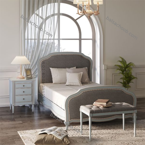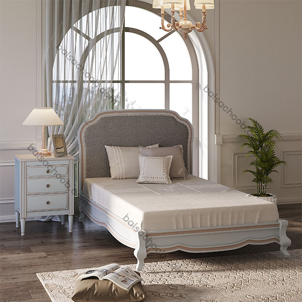 تخت خواب یک نفره ویولت با الهام از سبک نئوکلاسیک، ترکیبی هماهنگ از اصالت تاریخی و زیبایی مدرن را ارائه میدهد. رنگ خاص این مدل با آبی چرک روشن و پتینههای آنتیک قهوهای سرد، فضایی آرام و در عین حال شیک ایجاد میکند که برای اتاق نوجوانان و جوانان انتخابی بینظیر است.